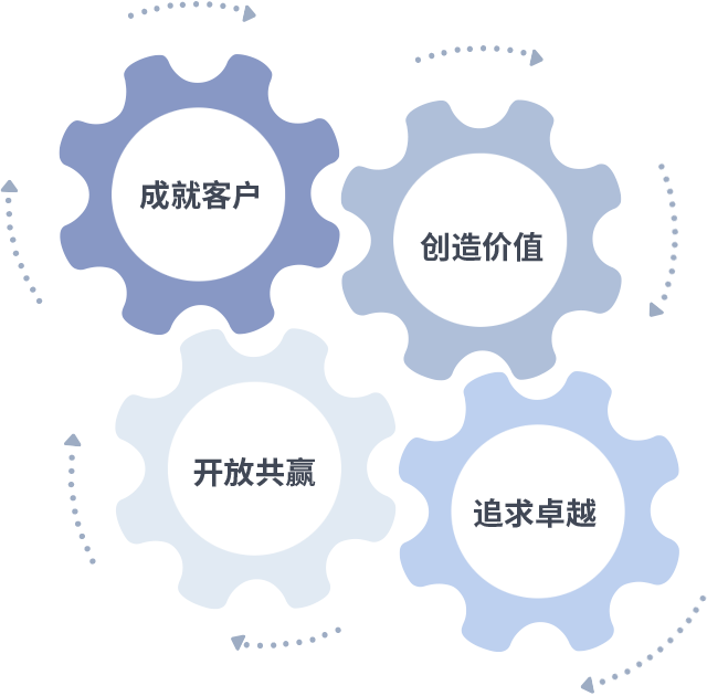 成就客户是一切决策的出发点,创造价值是衡量所有工作的标准,追求卓越是胜天国际做事做人的态度,开放共赢是胜天国际的格局也是最终的结果。价值观的齿轮环环相扣,推动着组织里的每个人不断向前。